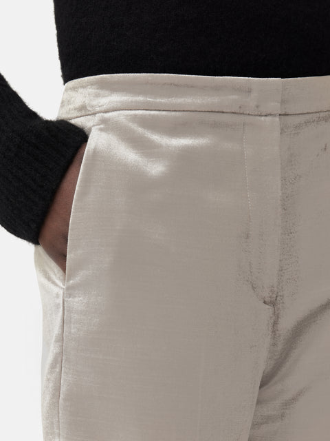 Tailored from lustrous velvet into a medium high rised trouser that?s slim fitting through the hips and thigh with a kick flare hem. Features a zip fly front with a hook and bar fastening, side pockets and back jetted pockets. Arrives with a matching blazer, and waistcoat in the silver colourway, this velvet set makes stand-out occasion wear. Fit and Features