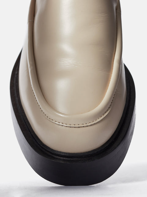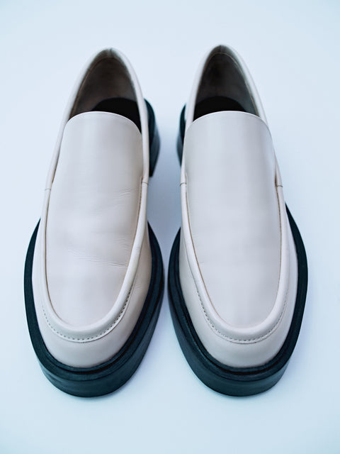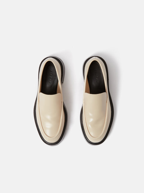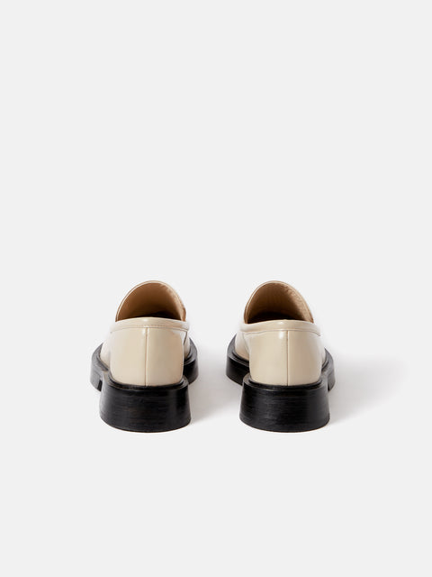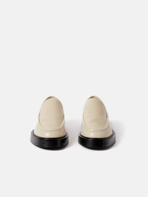 With it's clean, elongated upper and chunky sole the Wickham loafer is a modern twist on an iconic penny loafer. Made in soft glossy box leather and with piping detail along the top line for added detail. Perfect paired with tailored trousers and under denim. Fit and Features