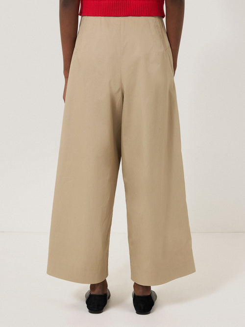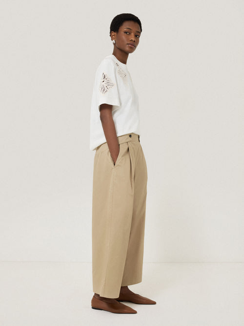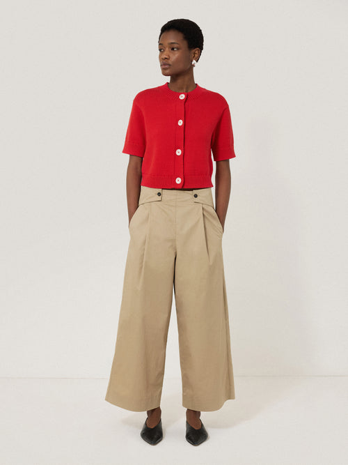 Smart dressing for the warmer months just got easier with these wide leg trousers. Crafted from a crisp, lightweight cotton, button tabs at either side of the waist as well as front pleats echo traditional tailored details.