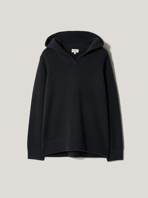 Wear luxurious comfort in the Wool Blend hooded jumper in navy for a way to elevate a dressed down look. With a pull-on style and v-neck with ribbed hems, wear this on off-duty days. Sofia is 5'9.5 and wears a size 8