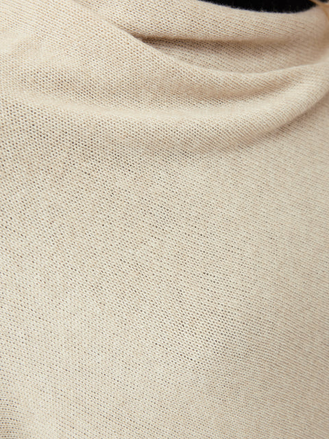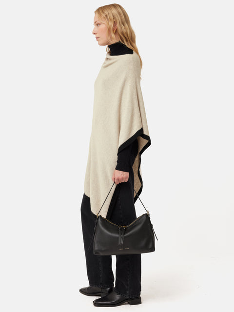A monochromatic blend of buttery vintage cream with a black contrast border, this supersoft poncho can be positioned in multiple ways.