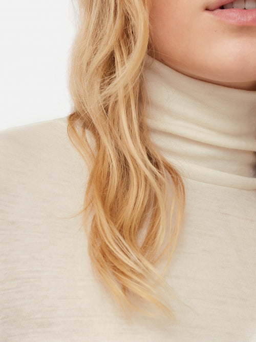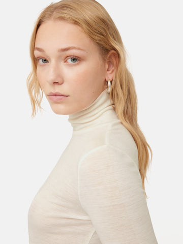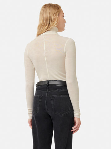Knitted from pure merino wool, this subtly ribbed polo neck sweater is the perfect lightweight underpinning for the season ahead. Slim-fitting, long slim sleeves with a turtle neck that can be worn, folded, unfolded or scrunched up. Semi-sheer, layer under tailoring or dresses to winter-proof your outfit or to add a pop of colour.