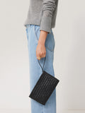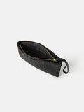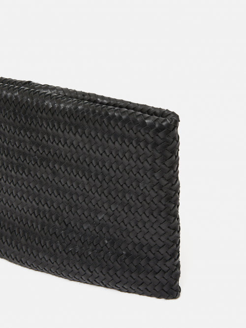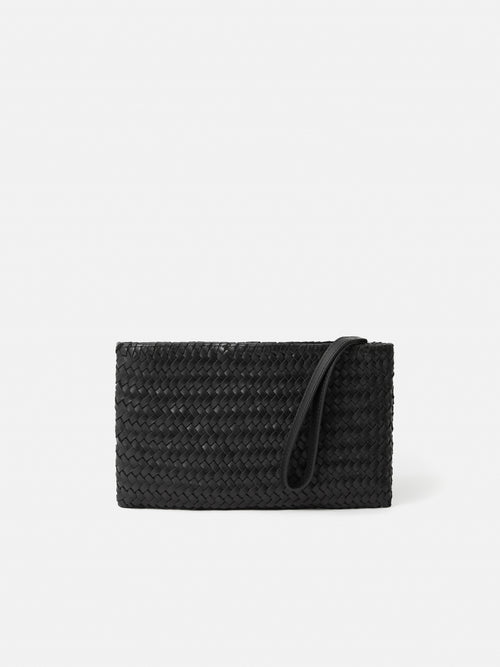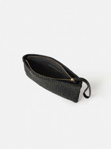 Woven by hand and imagined in a sultry hue, the Woven Leather Pouch is the perfect accessory for any summertime occasion. Keep your belongings safe with a zip closure and wrist strap.