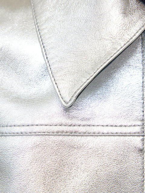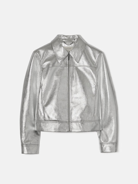 The ultimate biker jacket in space-age silver. Short silhouette crafted from pure Nappa leather, fully lined with a zip through front. Bracelet length sleeves fastened by magnetic closures. Style with matching Silver Leather Regent Jean to create a two piece that's out-of-this-world, or add a metallic flash styled over your everyday dress. This style also arrives in plain black leather. Fit and Features